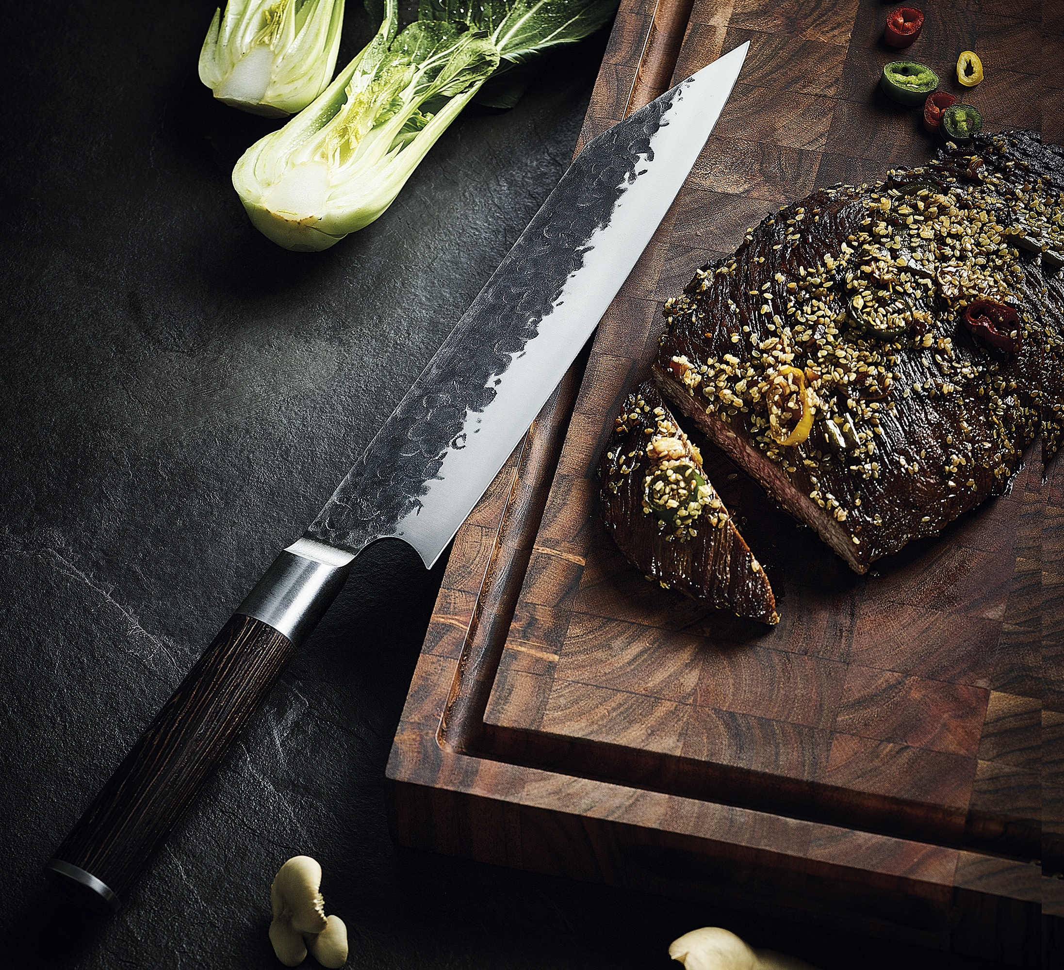 Die Messer der Serie KYOTO werden auf traditionelle Weise in einer kleinen Messer-Manufaktur von Hand geschmiedet, gehärtet, geschliffen und poliert. Die Klingenoptik mit Hammerschlag macht jedes Messer zum Unikat und sorgt für ein einzigartiges Aussehen. Jedes Messer wird nach der Fertigung sorgfältig in eine attraktive Aufbewahrungsbox aus gebranntem Holz verpackt.