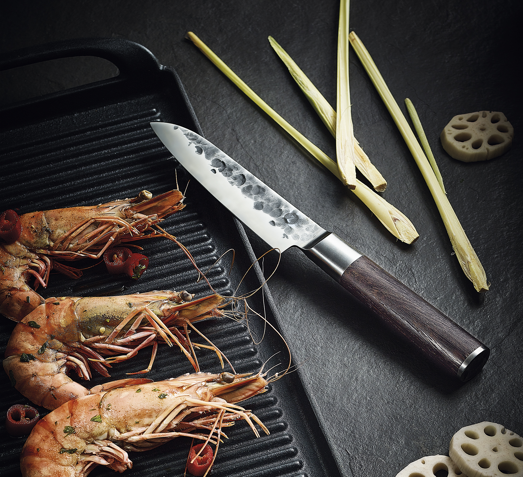 Die Messer der Serie KYOTO werden auf traditionelle Weise in einer kleinen Messer-Manufaktur von Hand geschmiedet, gehärtet, geschliffen und poliert. Die Klingenoptik mit Hammerschlag macht jedes Messer zum Unikat und sorgt für ein einzigartiges Aussehen. Jedes Messer wird nach der Fertigung sorgfältig in eine attraktive Aufbewahrungsbox aus gebranntem Holz verpackt.