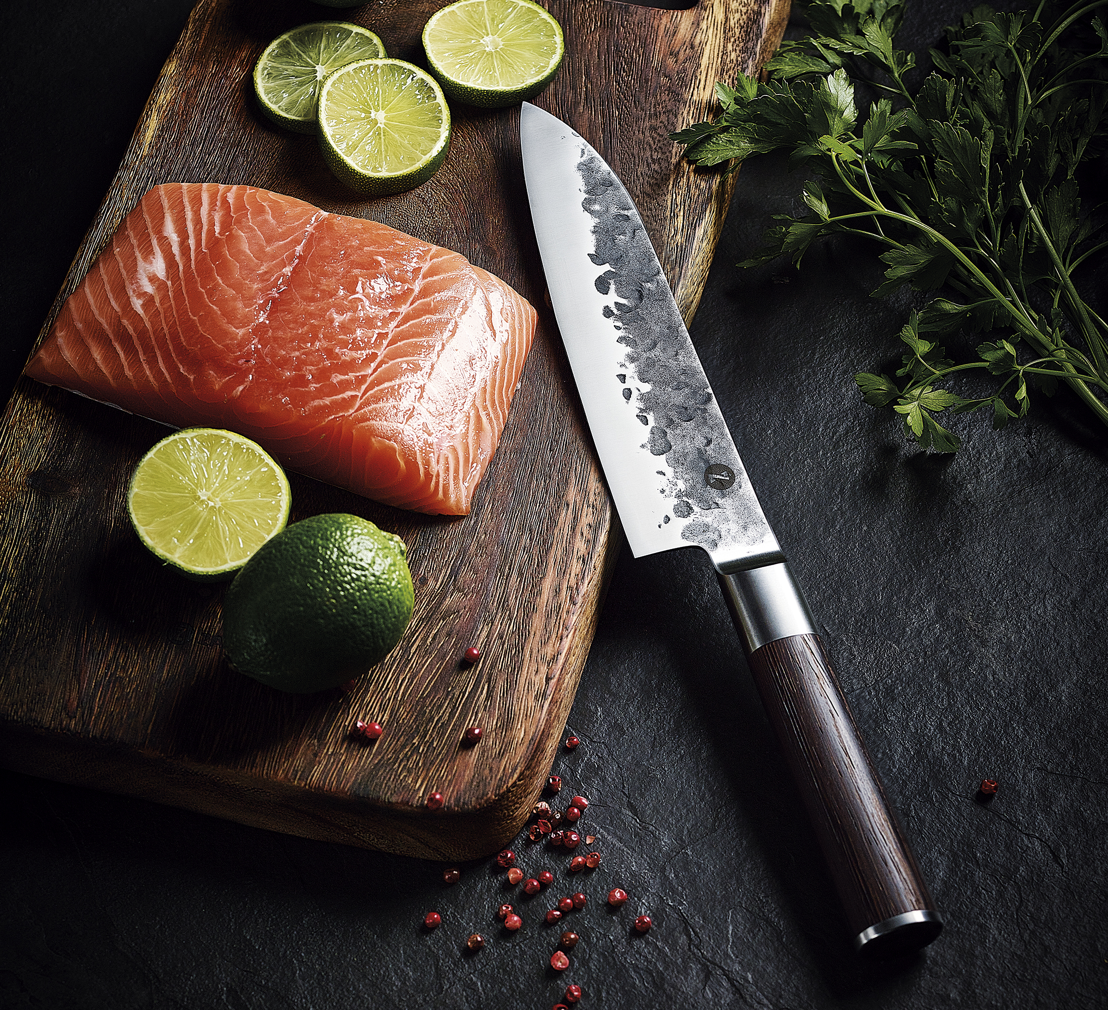 Die Messer der Serie KYOTO werden auf traditionelle Weise in einer kleinen Messer-Manufaktur von Hand geschmiedet, gehärtet, geschliffen und poliert. Die Klingenoptik mit Hammerschlag macht jedes Messer zum Unikat und sorgt für ein einzigartiges Aussehen. Jedes Messer wird nach der Fertigung sorgfältig in eine attraktive Aufbewahrungsbox aus gebranntem Holz verpackt.